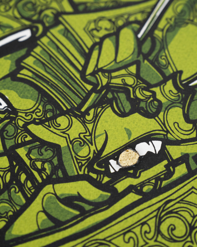 Hand-embellished with 24-carat gold, the print highlights the irony of the “money eat money” mantra through the medium of the very wealth it critiques.