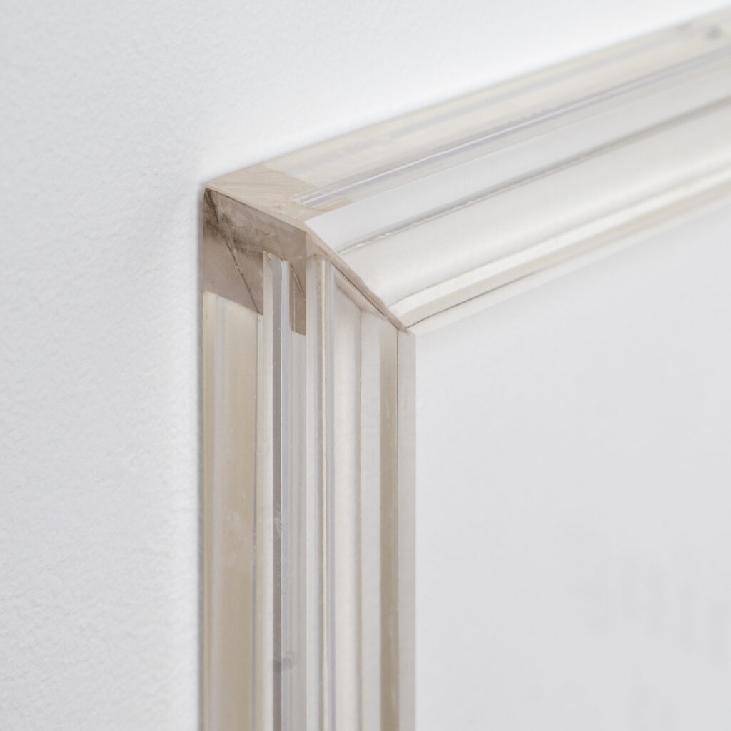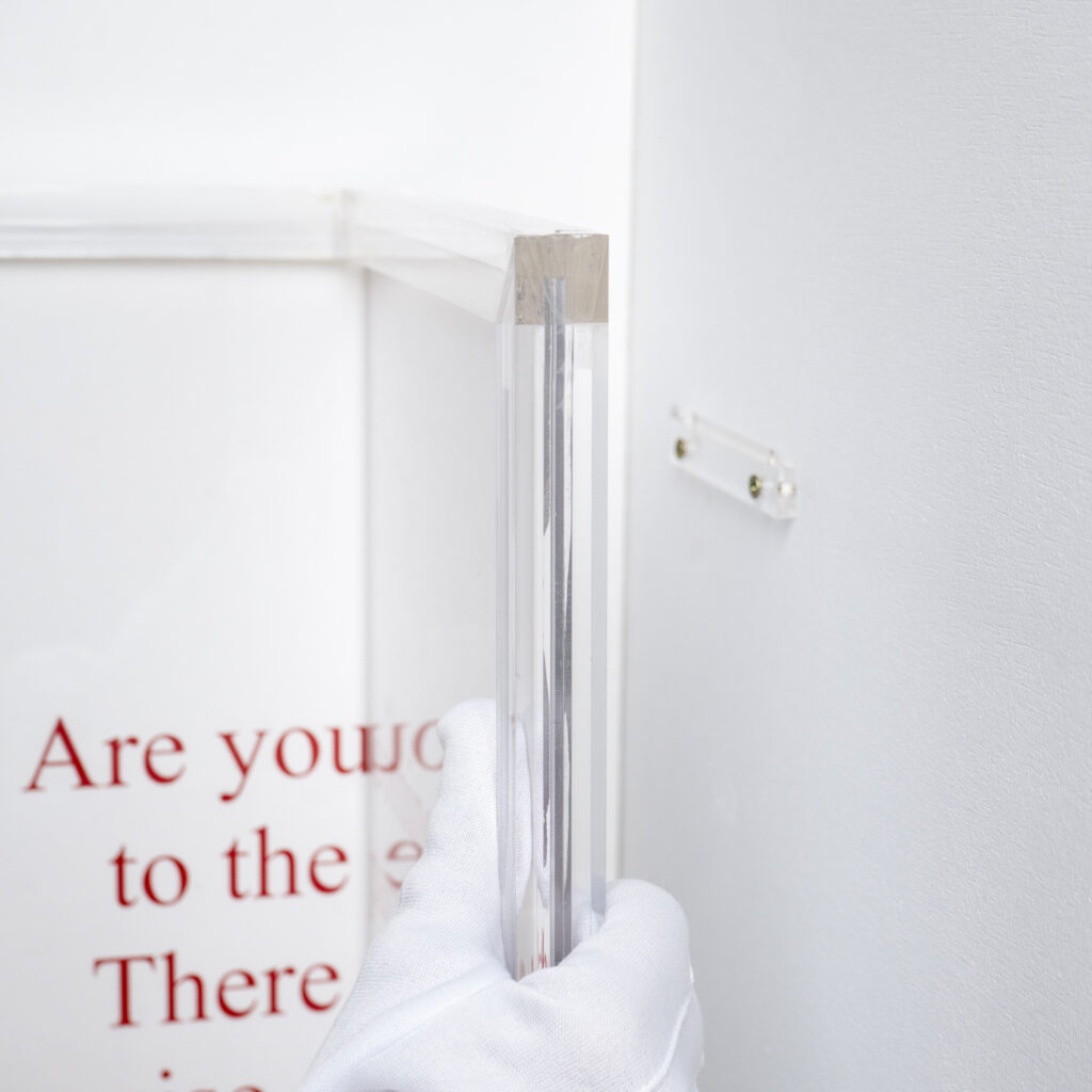 Each edition is presented in a custom, artist-designed transparent acrylic frame, intentionally folded at a 90-degree angle. The physical bend echoes the ‘corner‘ invoked in the poem, allowing the work to exist as both a print and a spatial object. Through this simple yet deliberate gesture, Teoh transforms a poem into a metaphysical sanctuary away from the ‘noise and lights‘.