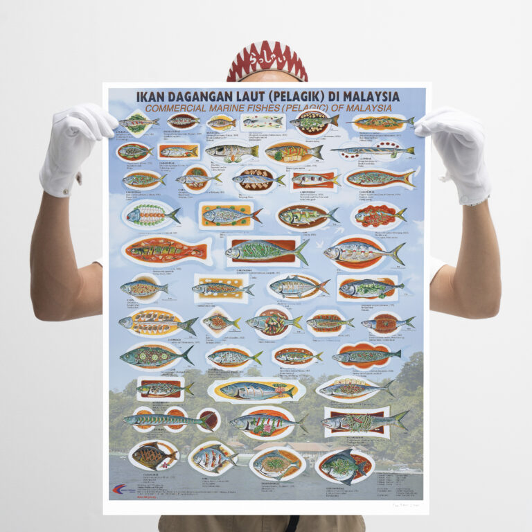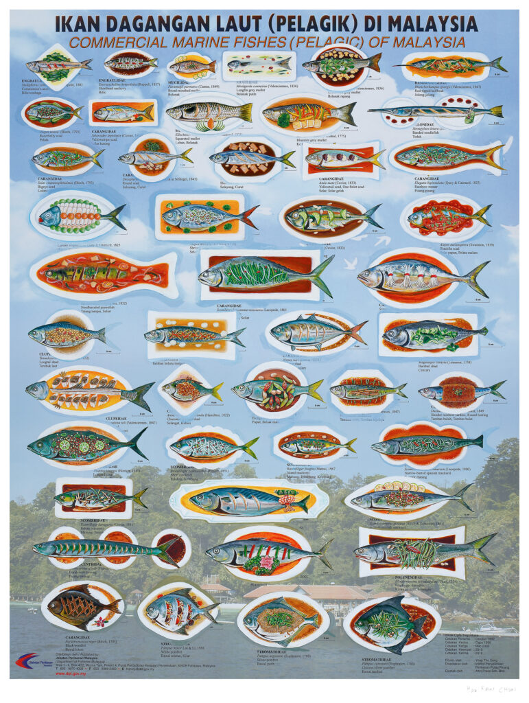 Commercial Marine Fish (Pelagic) of Malaysia reimagines an official fisheries reference poster produced by the Department of Fisheries Malaysia, transforming the scientific chart of pelagic fish into a playful all-fish restaurant menu.