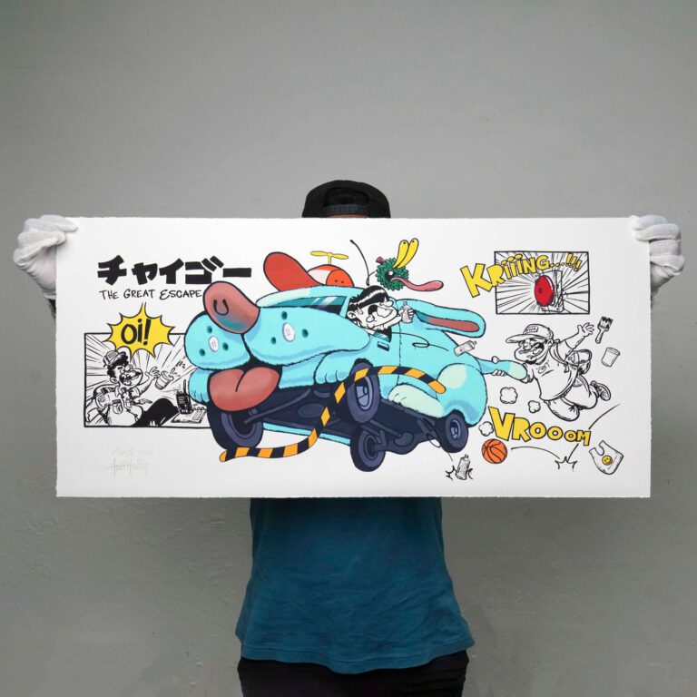 No stranger to the art scene, Kenji Chai’s alter ego “Chaigo,” an homage to the resilient spirit of stray dogs, has collected an almost cult-like following for his inspiring personal message and ubiquitous public art. After his wildly popular, sold-out edition of ‘Chaigo Slide’ print, Kenji Chai is back at Cultprint with another iconic collaboration. This time, Kenji joins creative powers with Malaysian cartoonist and caricature artist Azmi Hussin.